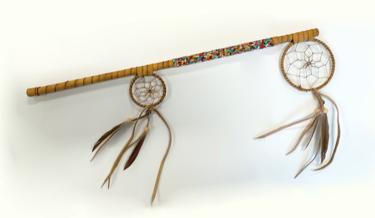 Navajo-intiaanien käsintekemä puhujan keppi, jossa koristeena kaksi unisiepparia.