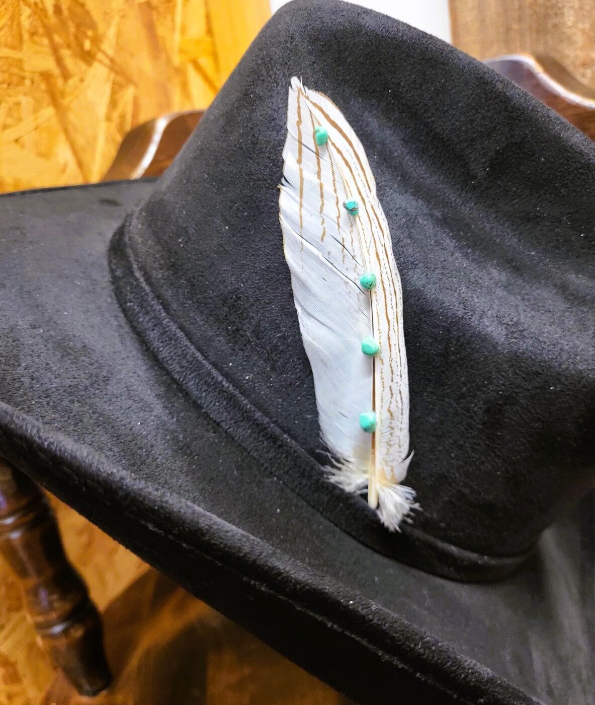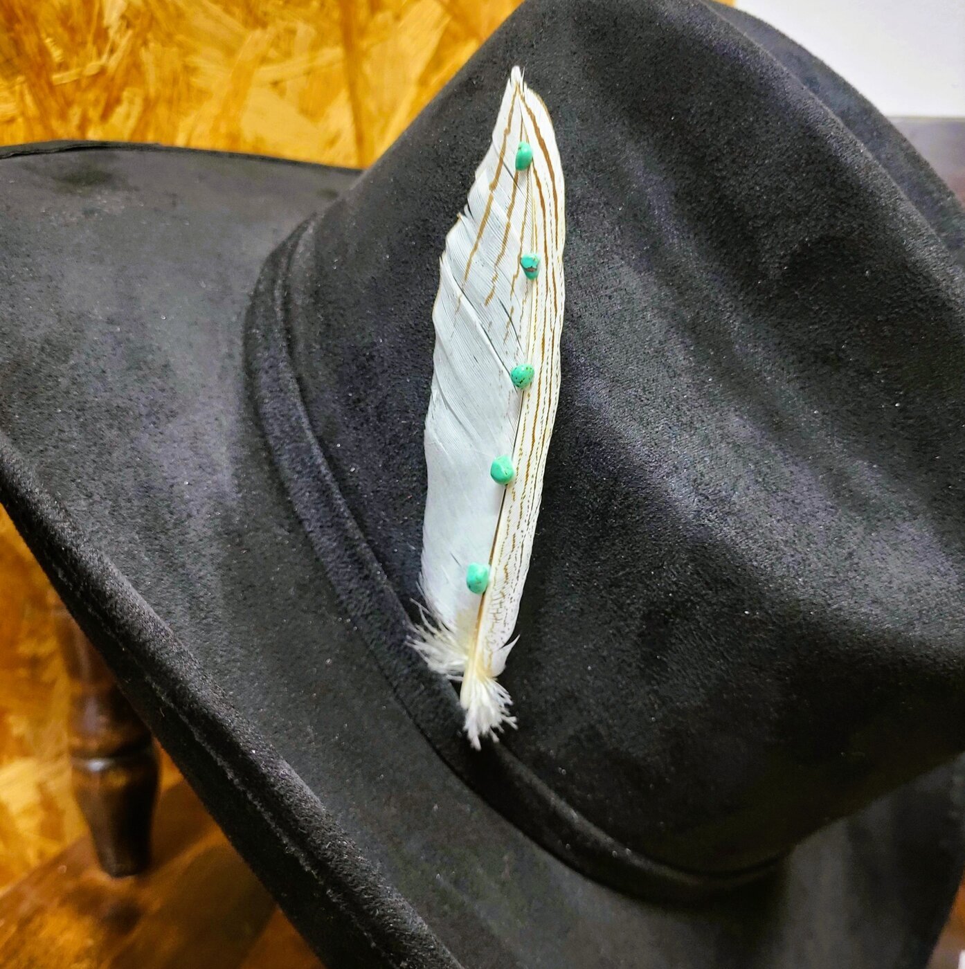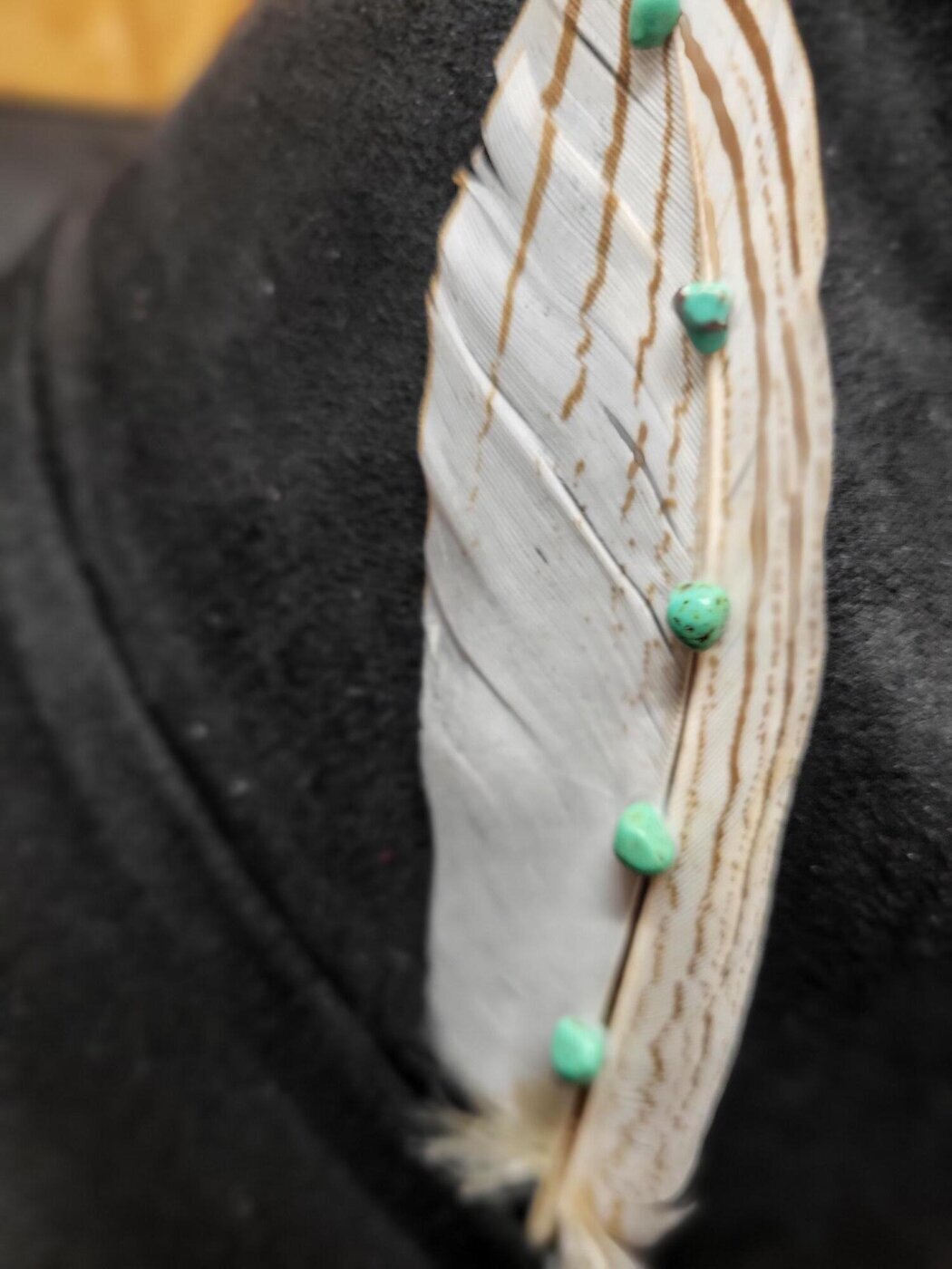 Yksittäinen, aito, vaalea luonnon sulka, jossa koristeena turkoosin värisiä kiviä, koristeeksi esim. hattuun.