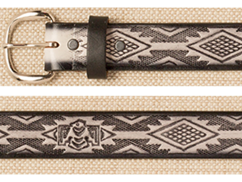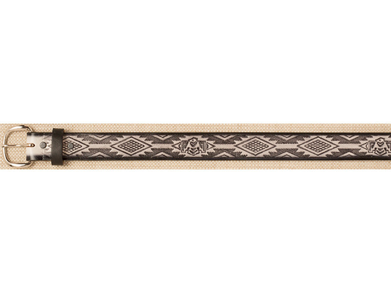 Musta/vaalea kuvioitu nahkavyö. Vyössä nepparikiinnitteinen, helppovaihtoinen solki.