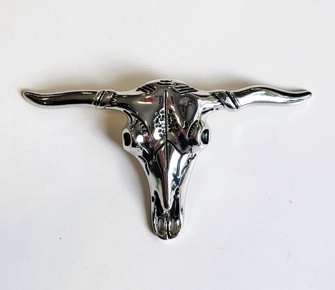 Kiiltävän hopean värinen, härän kallon muotoinen vyönsolki.