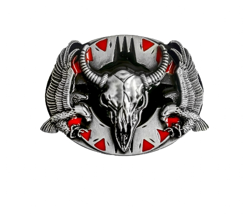 Intiaanihärkä -vyönsolki, jossa taustalla punaiset koristeet.