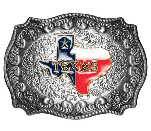 Texas -vyönsolki. Tumma metallin värinen koristeellinen tausta, Texasin muotoinen alue koholla taustaan nähden ja se on painettu kullan väriselle pohjalle.