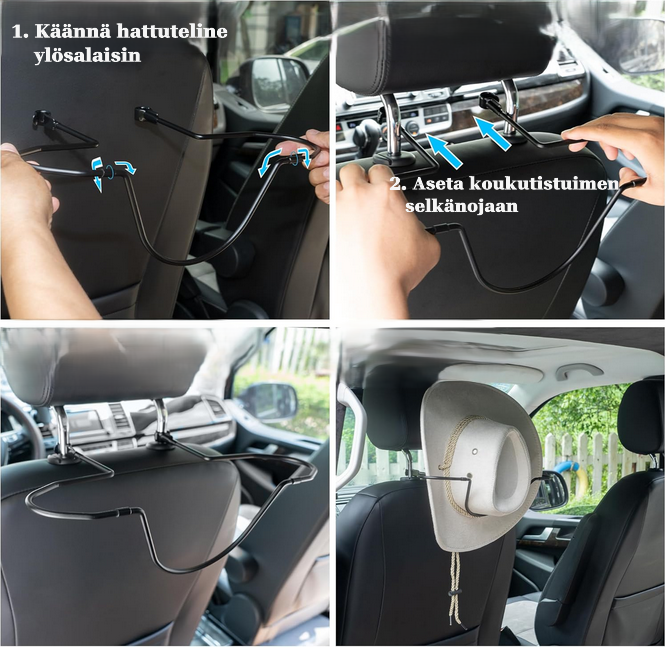 Hattuteline on helppo asentaa – paina se vain auton istuimen niskatuen tappeihin kiinni.